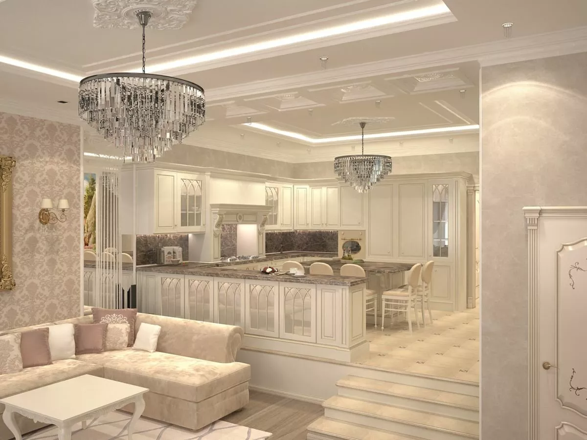 Потолок выполняется в белом цвете или близких ему вариациях. Предпочтительно умеренное декорирование лепниной: потолочными карнизами, розетками, молдингами. Они добавляют небольшой орнамент на потолки, сочетающийся с общим дизайном кухни. В малогабаритных помещениях использование лепнины и дополнительного декора на потолках не рекомендуется. Здесь достаточно будет не слишком широкого карниза.