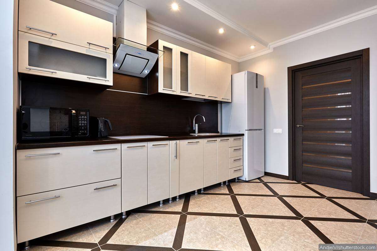 На кухне высокая влажность, поэтому нужно позаботиться о безопасности пола. Влагостойкий ламинат поможет хозяйке не поскользнуться во время готовки и не испортится от пролитой воды.