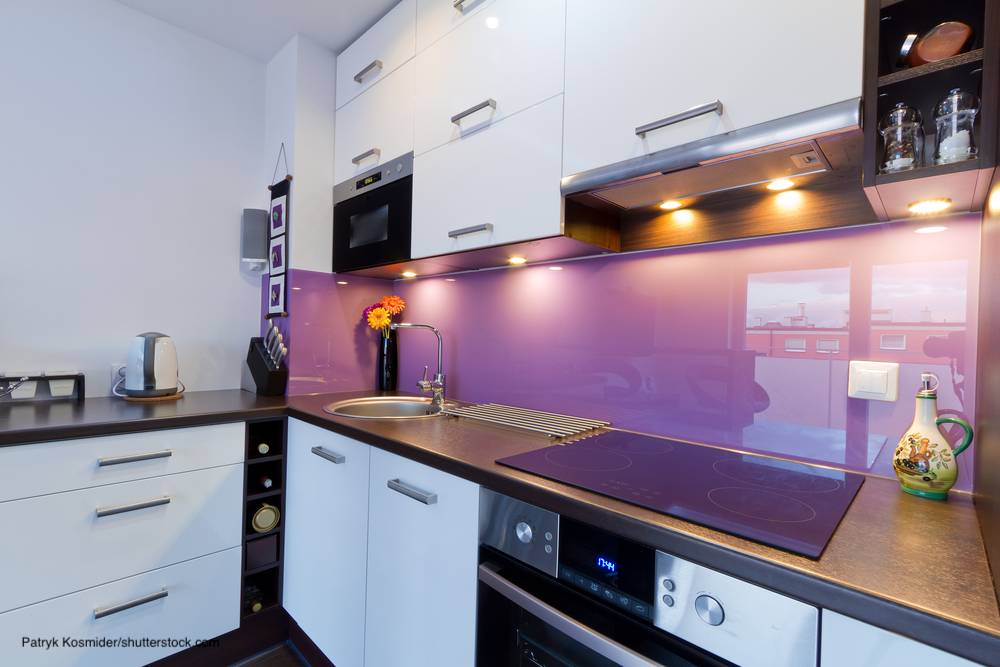 Закаленное стекло, подобранное под цвета интерьера хорошо подойдет для фартука.
