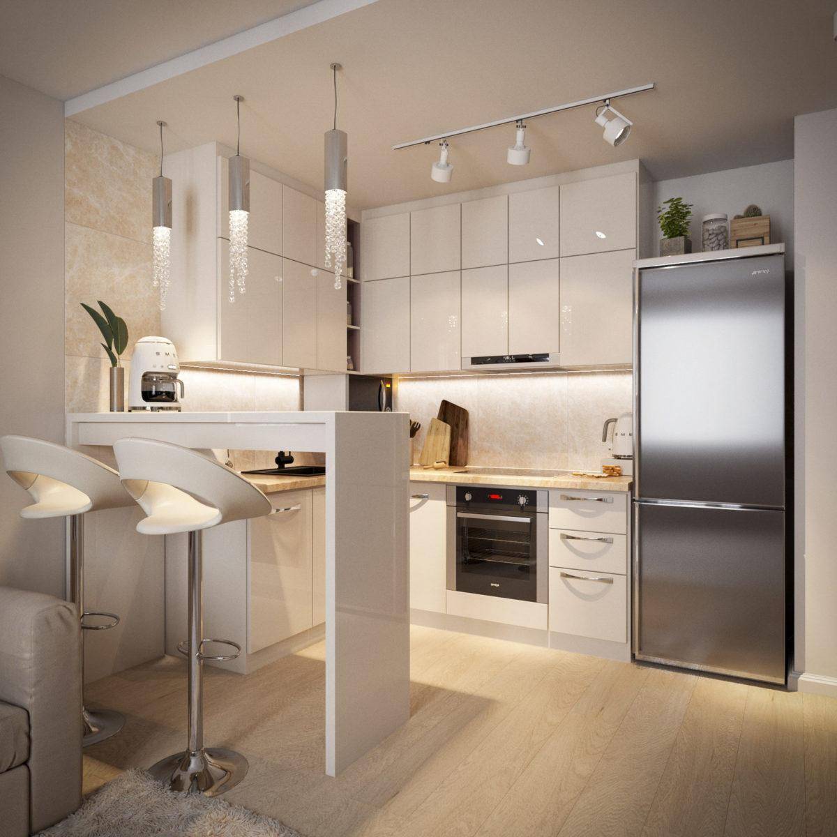 Основной цвет в дизайне маленькой кухни – белый, что делает ее визуально просторнее. Обеденный стол складывается в целях экономии места. Его столешница из натурального дерева смягчает строгую стилистику отделки и делает кухню уютнее.