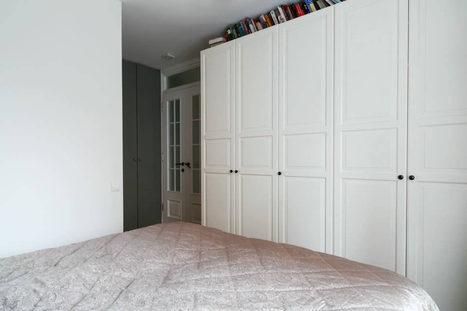 Спальня увеличилась в размерах, благодаря продуманной системе хранения вещей – в огромном встроенном шкафу, в подлокотниках кровати и даже за гардинами.