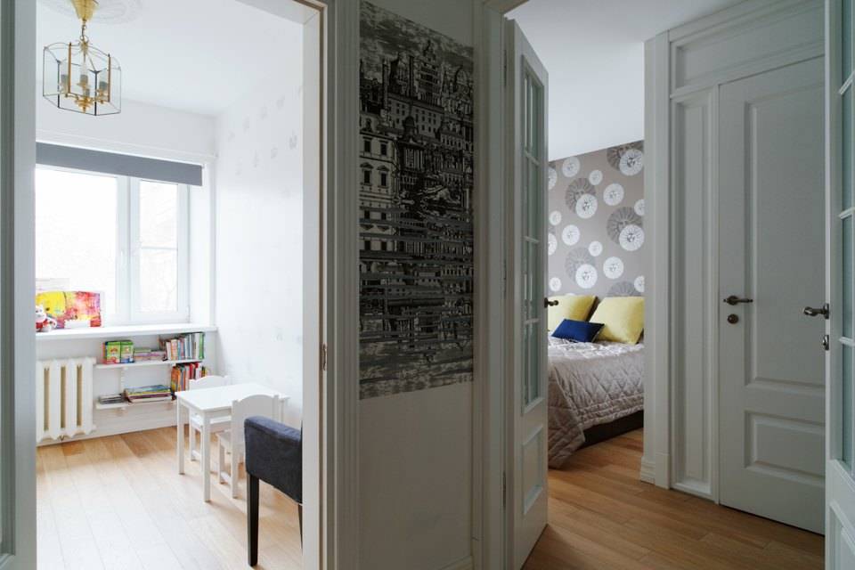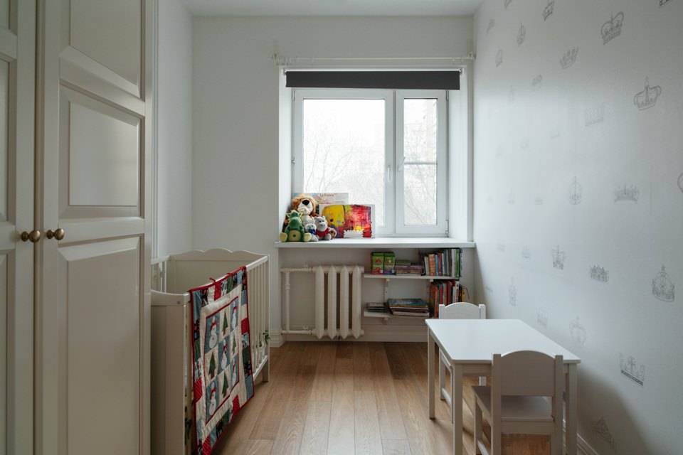 Дизайнеры провели серьезную перепланировку – кухню перенесли в гостиную, а на ее месте сделали детскую комнату.