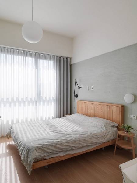 В комнате установлена комфортная двуспальная кровать. Низкое расположение ложа входит в моду. Это удачное решение для небольших трехкомнатных квартир. Благодаря низкому ложу кровати, потолок кажется выше. Эффект подчеркивает лампа, которая свисает на длинном проводе. Создается впечатление открытого и свободного пространства.