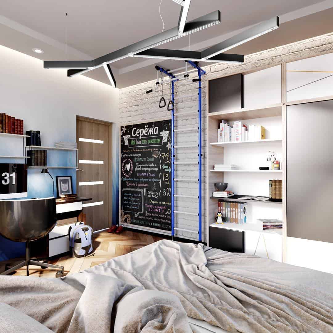Часть комнаты подроста стоит оборудовать в соответствии с его талантами и интересами, например, установив там пианино, спортивный уголок, мольберт с красками. Фото дизайна детской комнаты для мальчика-подростка можно увидеть ниже.