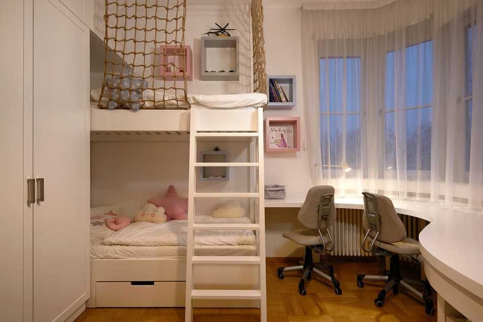5. Разнополых детей тоже приходится селить в одной комнате, но когда они повзрослеют, им придется разграничить места для сна. Но лет до 10-11 это будет общее помещение, потом мальчика отселят в другую комнату, но остается общая учебная зона. Интерьер для мальчика и девочки должен отражать их разносторонние интересы, фон – нейтральный.