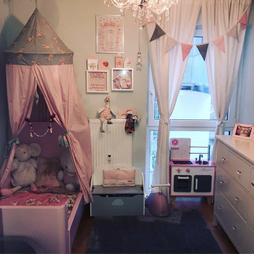 Прекрасный вариант обустройства комнаты для девочек. Но стиль можно «приспособить» и для мальчишек, играя с узорами и используя традиционно мужские оттенки цвета.