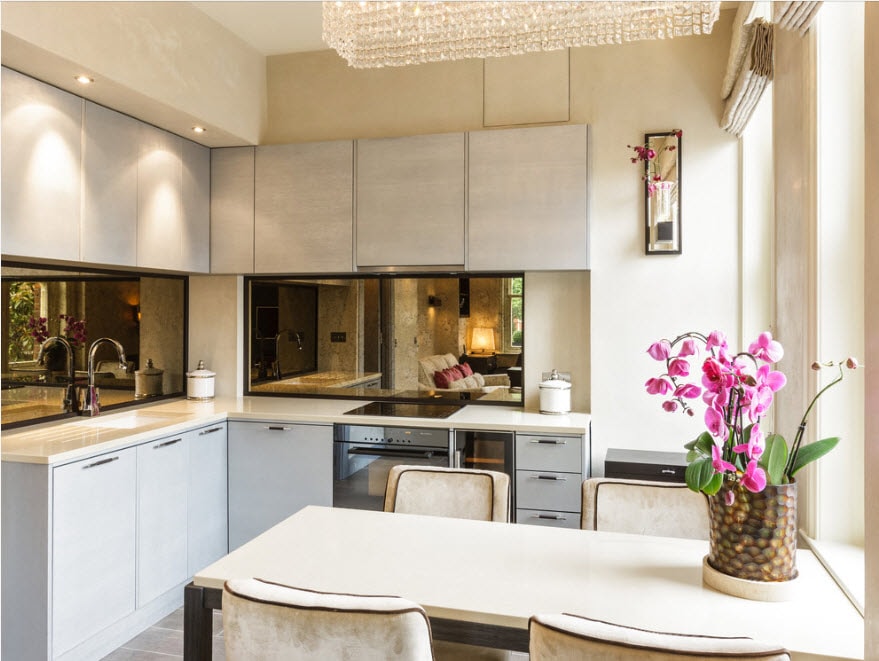 Зеркала. Используйте в интерьере зеркала, они визуально расширяют пространства и отражают свет. Можно просто повесить на стене небольшое зеркало либо заказать зеркальные дверцы для кухонных шкафчиков.