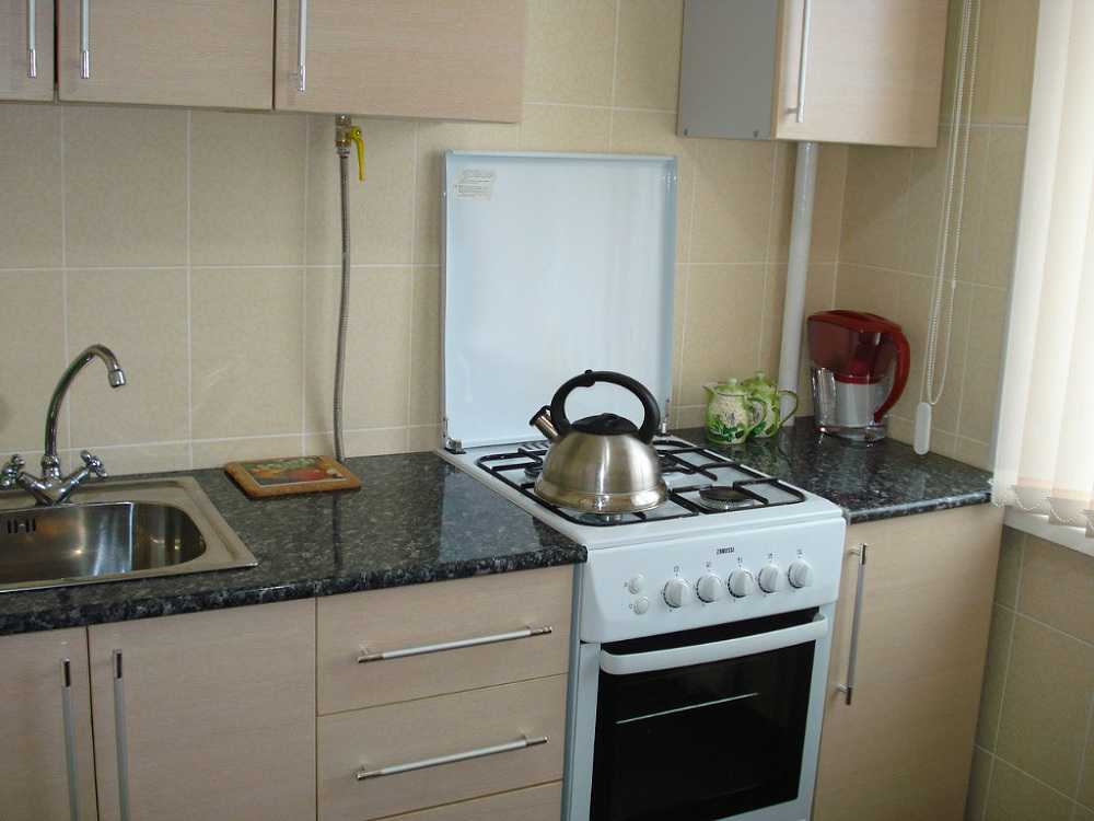 При расположении шкафов и бытовой техники на маленькой кухне в ряд, стоит соблюдать порядок: холодильник, раковина, плита. Расположение раковины посередине обеспечивает легкий доступ к воде во время первоначальной очистки продуктов и в момент приготовления. Вся бытовая техника на маленькой кухне должна быть отделена столешницей. Минимальная длина столешницы между холодильником и раковиной и с обеих сторон духовки составляет 40 см. На каждой маленькой кухне должна быть столешница длиной не менее 80 см. В прямой кухне обычно разделяется раковина и плита. На ограниченной площади плиту также можно разместить между холодильником и раковиной.