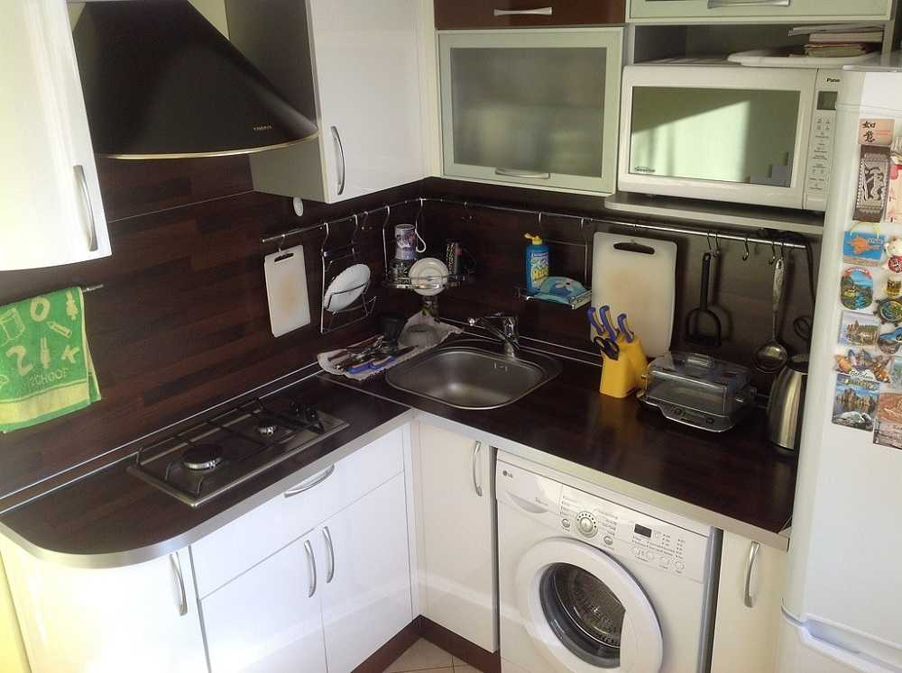 Для небольшой кухни удобно использовать технику меньших размеров – узкий холодильник, узкую стиральную и посудомоечную машины.