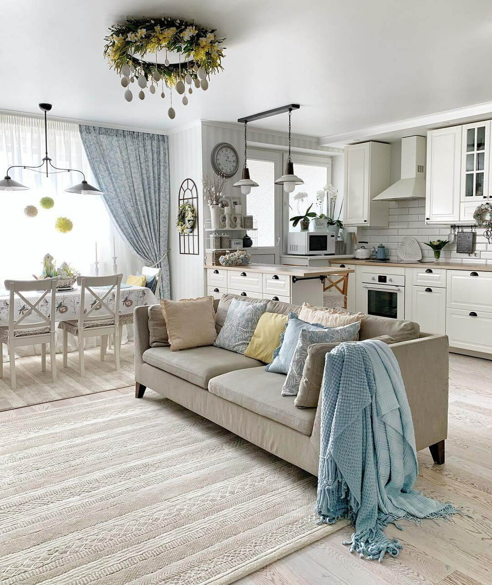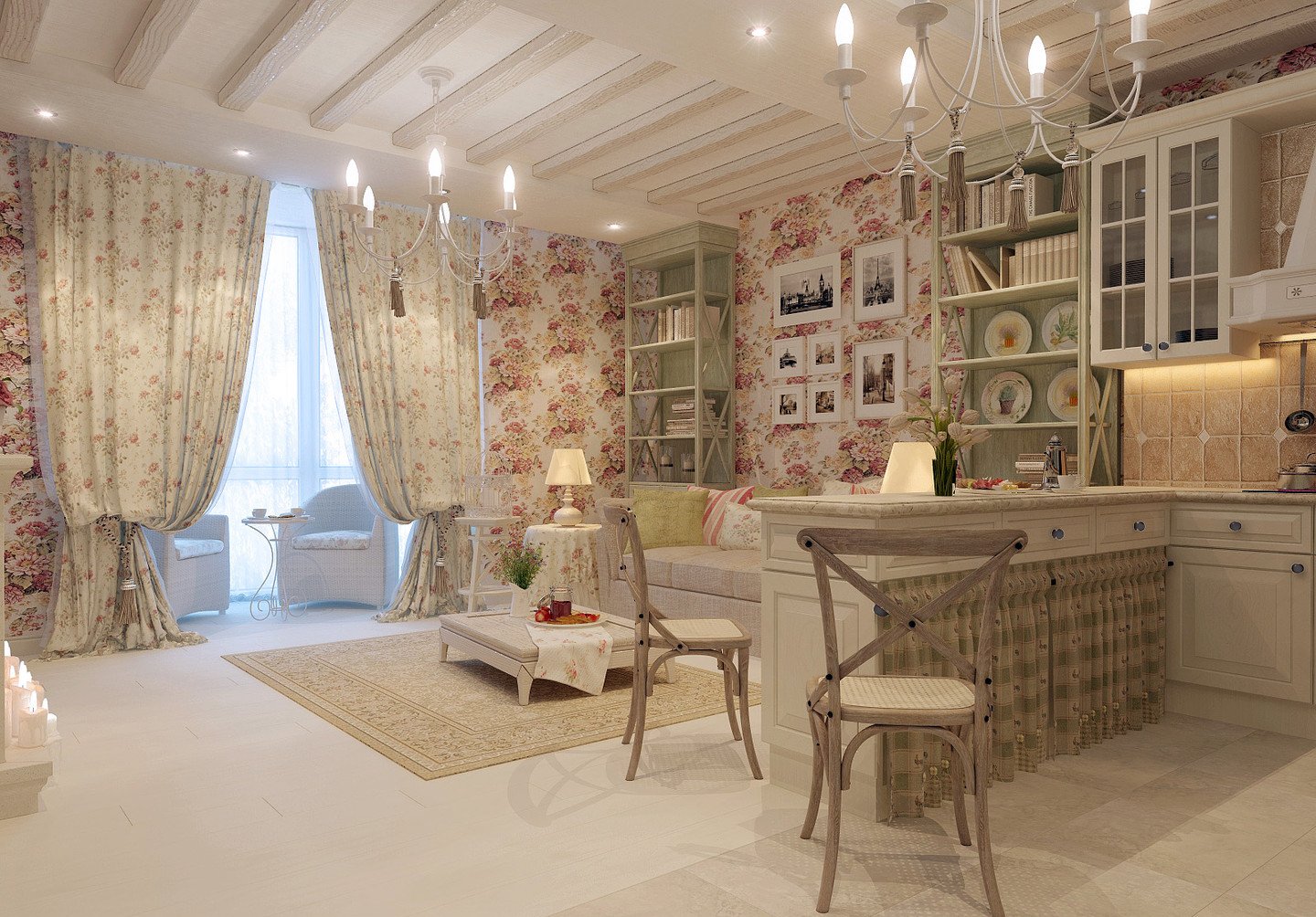 Прованс – это стиль, в котором каждая деталь передает романтику и нежность, теплоту и уют юга Франции, отсюда и название. Такой дизайн кухни-гостиной часто выполняется в ярких тонах. В нем используется много фактурных материалов, подходят аксессуары, декоративные элементы, текстиль, цветы. Цветовые палитры обычно приглушены. Первый выбор – натуральные материалы или их качественная имитация.