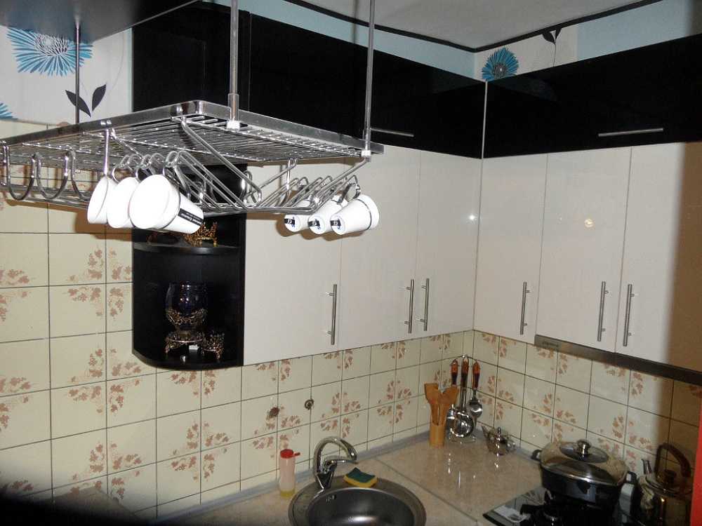 При выборе кухонного гарнитура, не достающего до потолка, стоит приобрести хотя бы один предмет интерьера такой высоты. Это создаст ощущение приподнятого потолка.