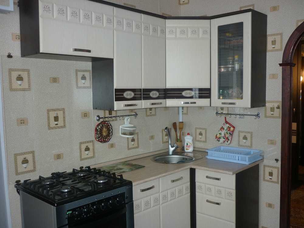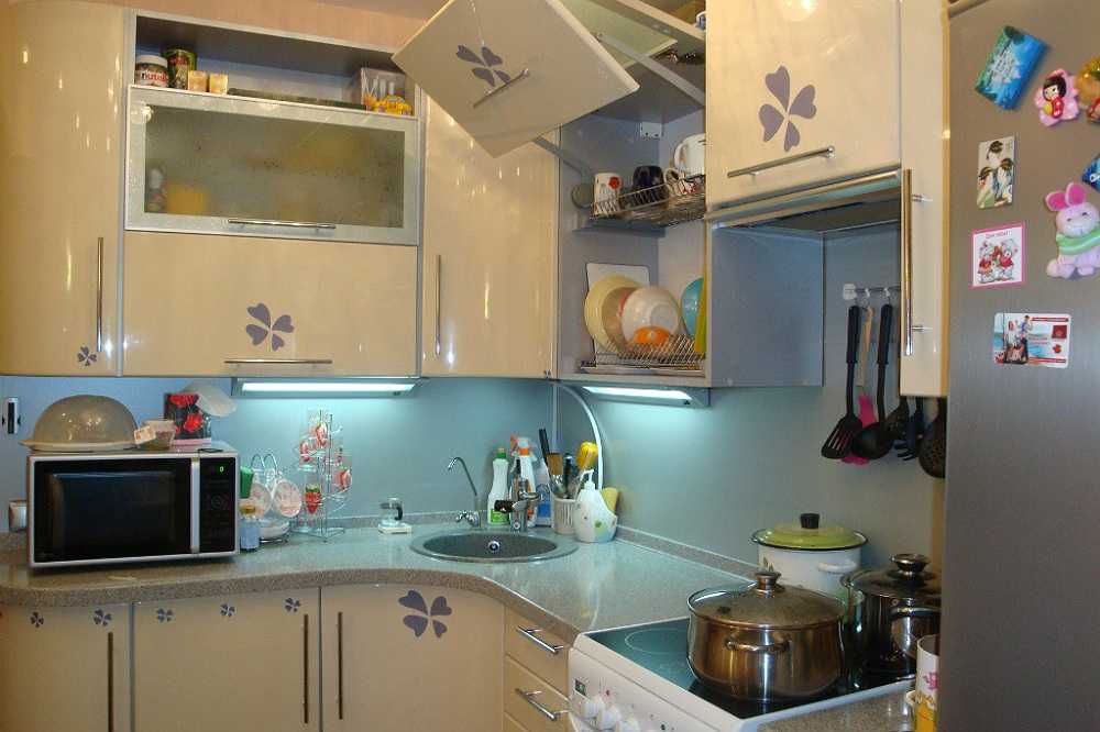В пространство миниатюрной кухни отлично впишутся угловой и прямой гарнитур. Первый предпочтительнее – встраивание в угол оставляет большее количество места свободным. Все шкафы, полки должны быть востребованными.