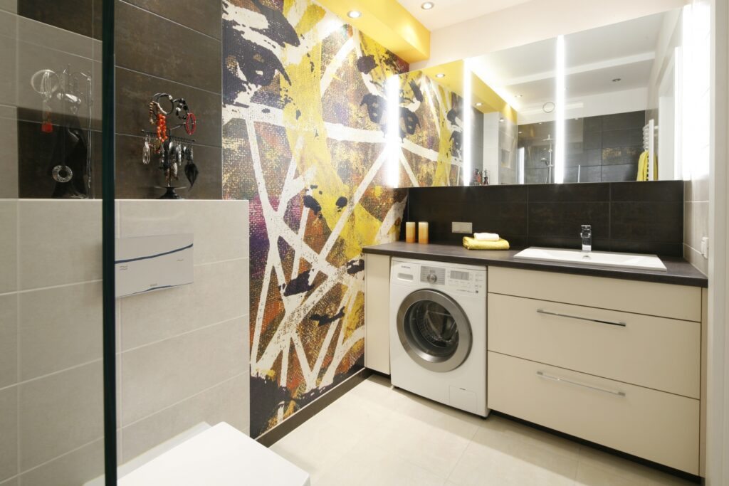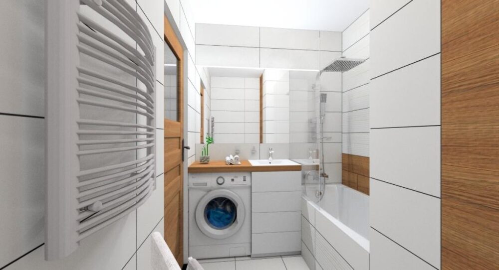 Стиральную машину рекомендуется размещать не возле ванны, а под умывальником или столешницей с ним. Такая расстановка потребует специальной раковины без сифона снизу, но зато техника не будет занимать драгоценные квадраты у стены. Также машинку можно вынести вовсе из санузла. В дизайне кухни или коридора она будет смотреться несколько неорганично, но при умелом обыгрыше все возможно.