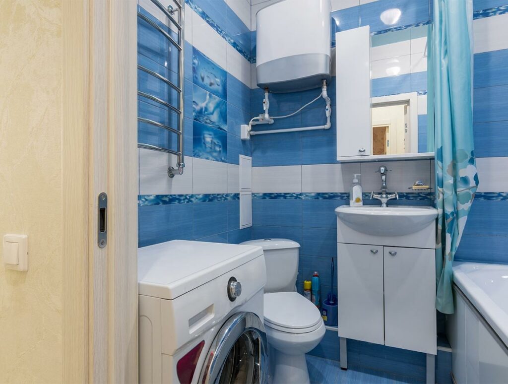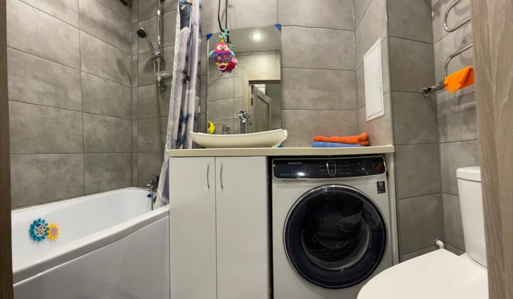 Во втором варианте места в комнате совсем мало. В таких случаях стиральную машинку устанавливают под раковиной, а над ней зеркальный шкафчик (он не съест много места, в нем можно будет хранить все необходимое, и при этом не нужно устанавливать зеркало).