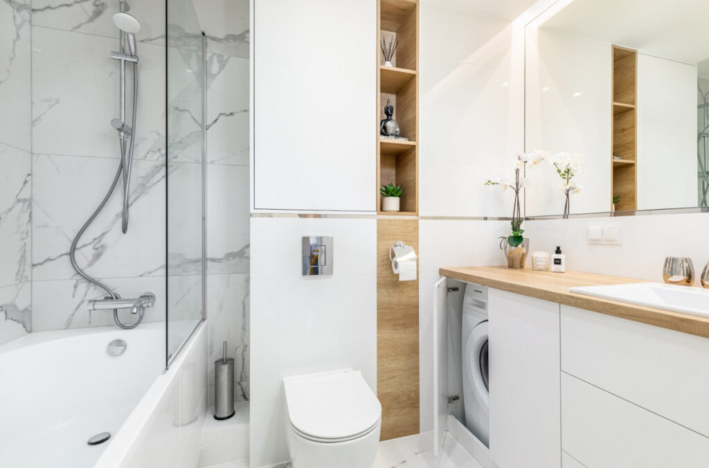Некоторые владельцы маленьких ванных комнат полностью отказываются от стиральной машины в ванной, например, размещая ее на кухне или встраивая в шкаф в прихожей. Однако в подавляющем большинстве квартир это оборудование неизменно находится в ванной комнате. К счастью, есть несколько умных способов интегрировать стиральную машину в любой интерьер. Встроенная стиральная машина в маленькой ванной занимает минимум ценного места и позволяет даже полностью скрыть свое оборудование.