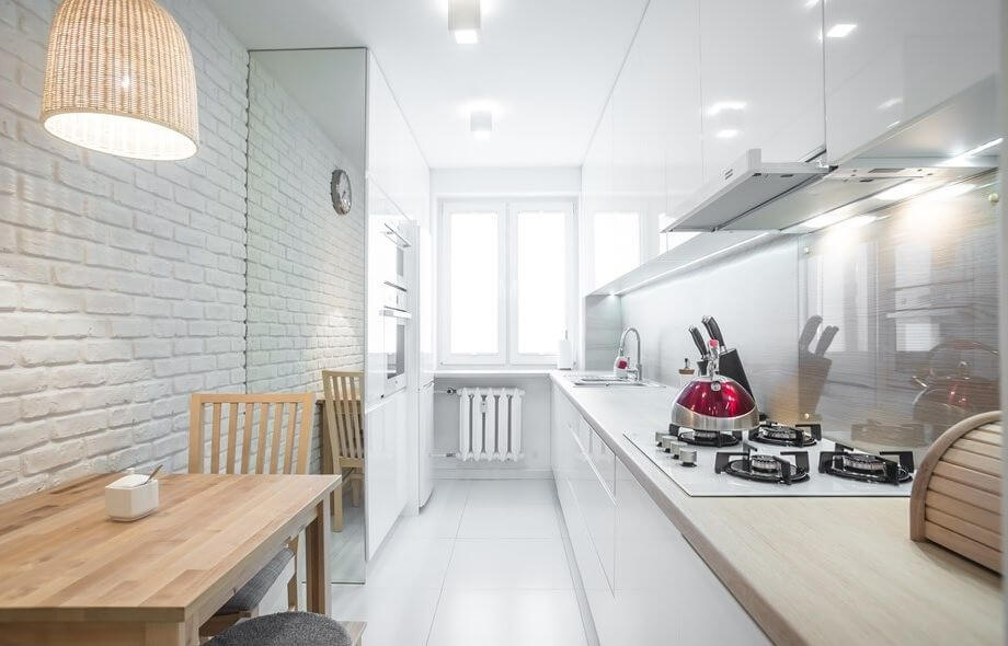 Линейное или параллельное расположение в прямоугольной кухне используют одну стену, или две параллельные. Угловая планировка в отличие от линейной, позволяет увеличить рабочую зону и место для хранения продуктов.
