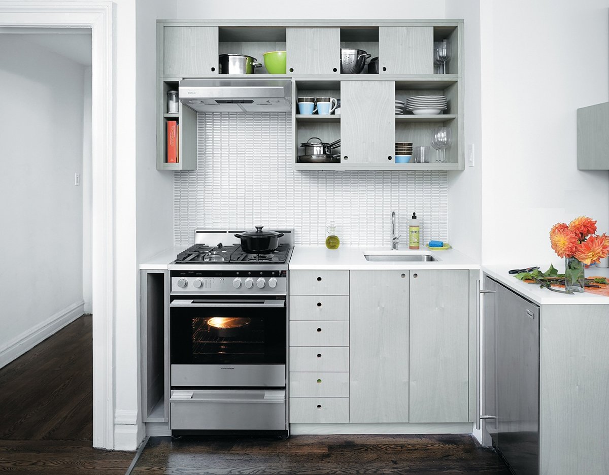 Еще одна модная тенденция — отказ от навесных шкафов. Правда, для маленькой кухни она подходит, только если хозяева крайне редко бывают дома и готовят там еду лишь от случая к случаю.