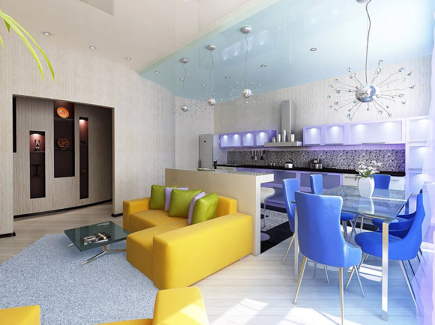 Если вы можете сделать перепланировку однокомнатной квартиры и превратить кухню и гостиную в одну комнату, не упускайте такую возможность! Открытая планировка кухни-гостиной всегда хорошо смотрится в современном интерьере. Зонирующим элементом в данном случае может выступать перегородка, диван, стол, люстра или даже материал для отделки пола или цветовые акценты.