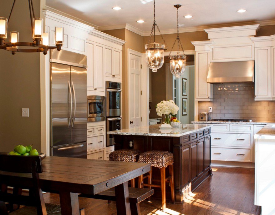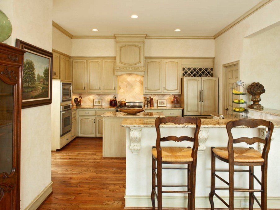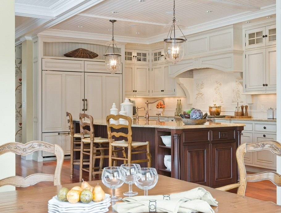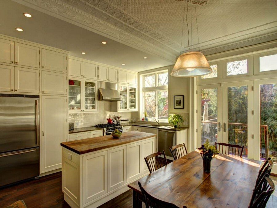В классическом интерьере уместно будут выглядеть как традиционные варианты оформления потолка – штукатурка, покраска, моющие обои, так и более современные — гипсокартоновые или натяжные варианты. При реализации кухонного интерьера в стиле прованс или кантри, оптимальным вариантом станет выбор соответствующих декоративных штукатурок.