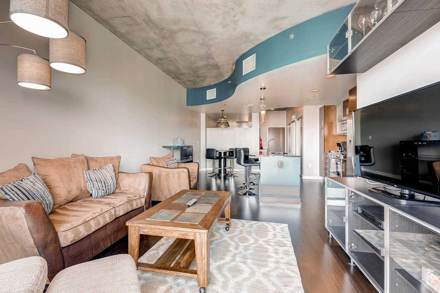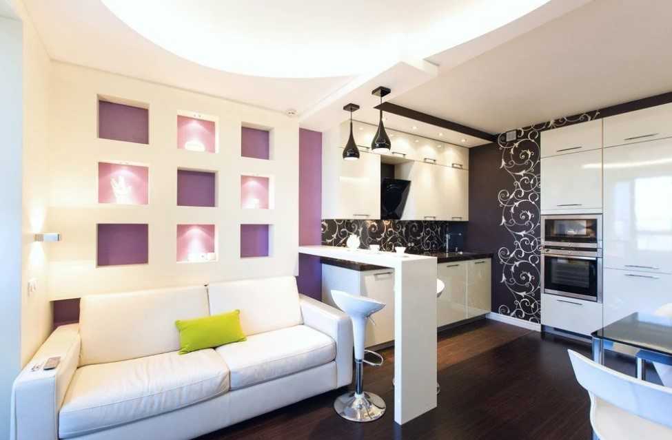Потолок в кухне-гостиной из гипсокартона может иметь разные формы: от одного до четырех уровней. Одноуровневые конструкции самые простые, достаточно украсить их софитами, и дизайн потолка закончен.