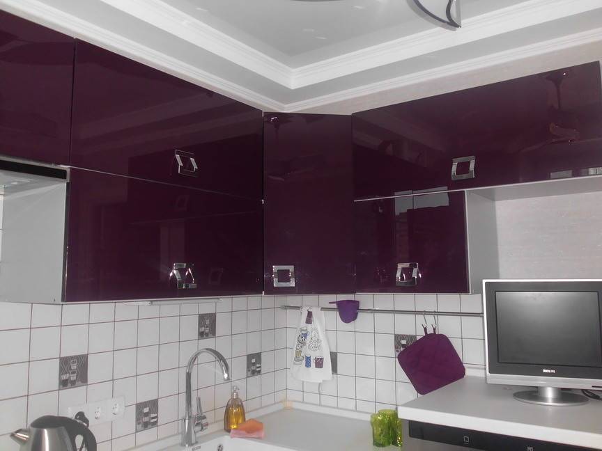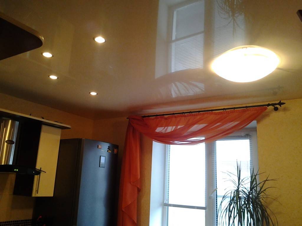 Пожалуй, это наиболее подходящий вариант, поскольку глянцевые поверхности проще всего в уходе, их легко мыть, они не впитывают в себя жир и грязь и не задерживают их на поверхности. Глянец отражает свет, что приближает поверхность такого потолка по свойствам к зеркальной. Он способствует увеличению освещенности, кухня кажется просторнее.