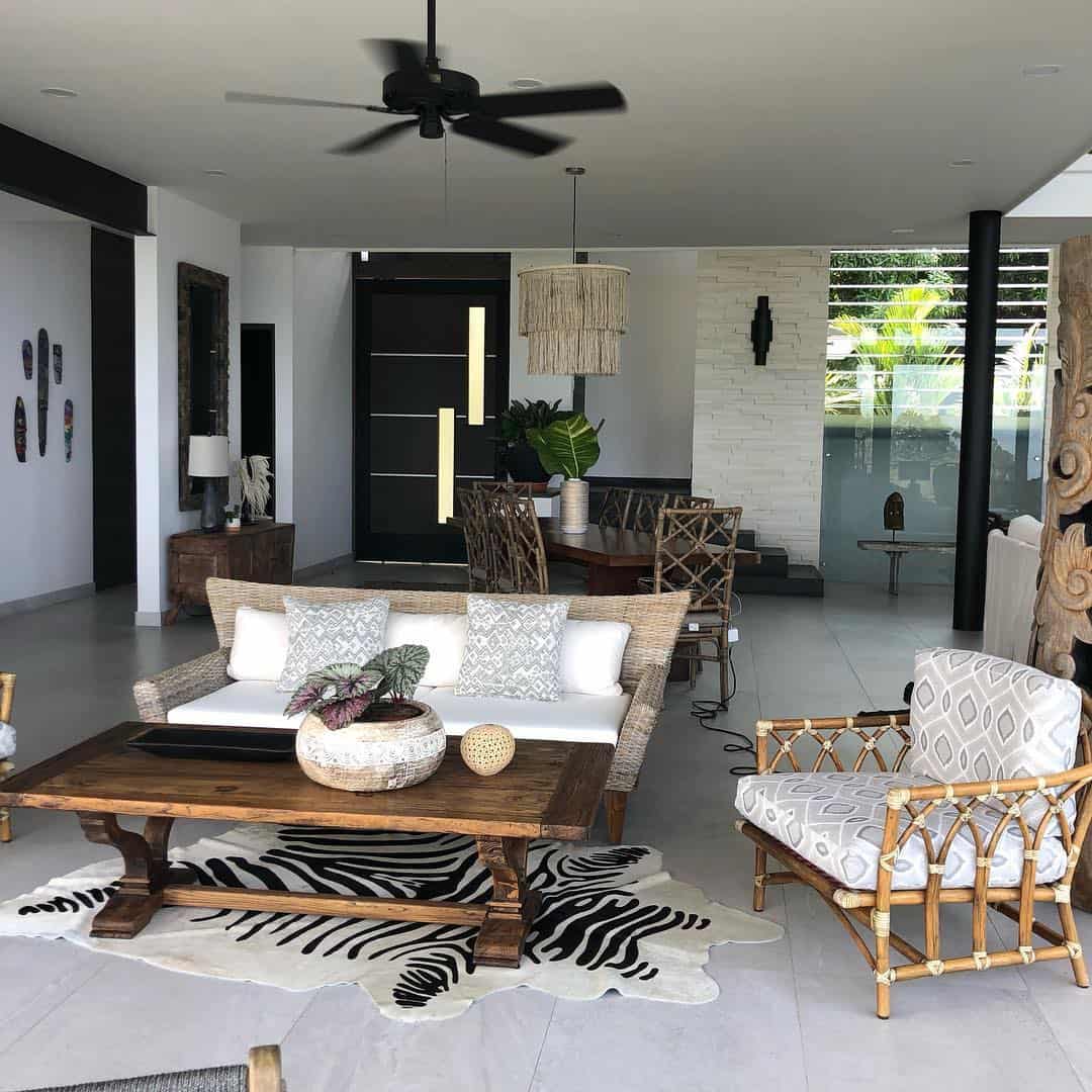 Этнические направления совмещают разные приемы, нередко в оформлении потолка заметны вполне уместные современные ноты. При оформлении потолка придается значение количеству предметов мебели и аксессуаров. Например, если в гостиной много места, есть обеденная зона, но помещение не загромождено мелочами, допускается многоуровневая потолочная конструкция.