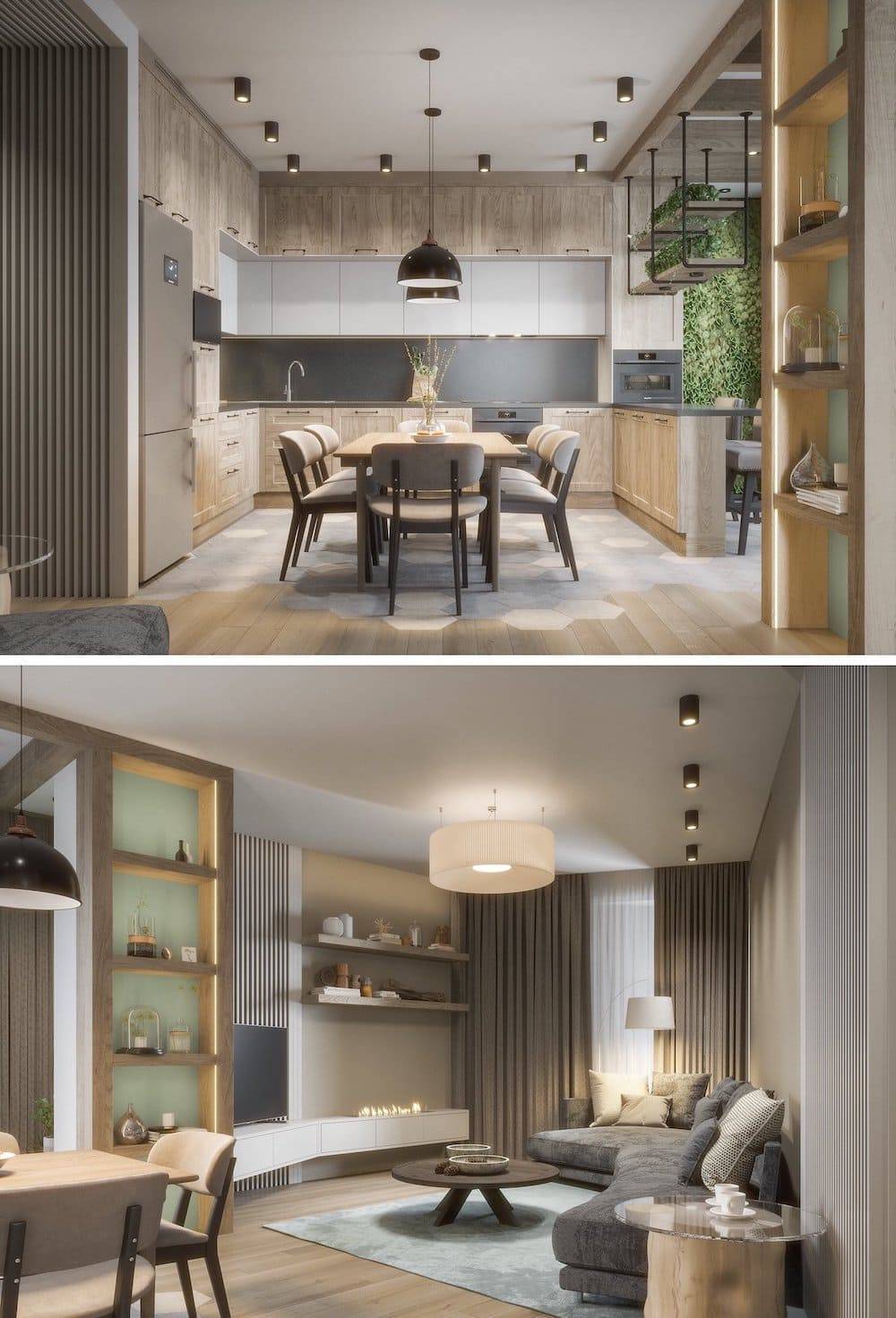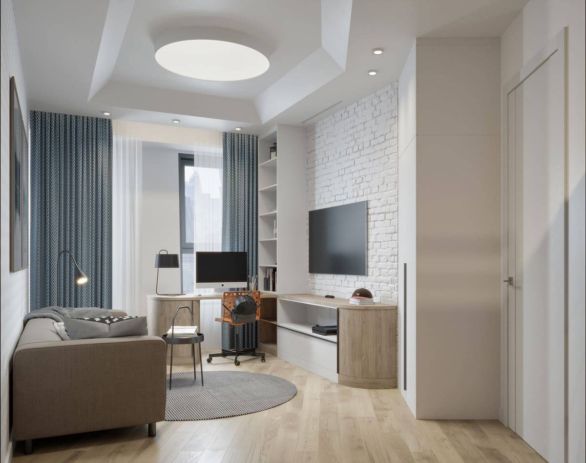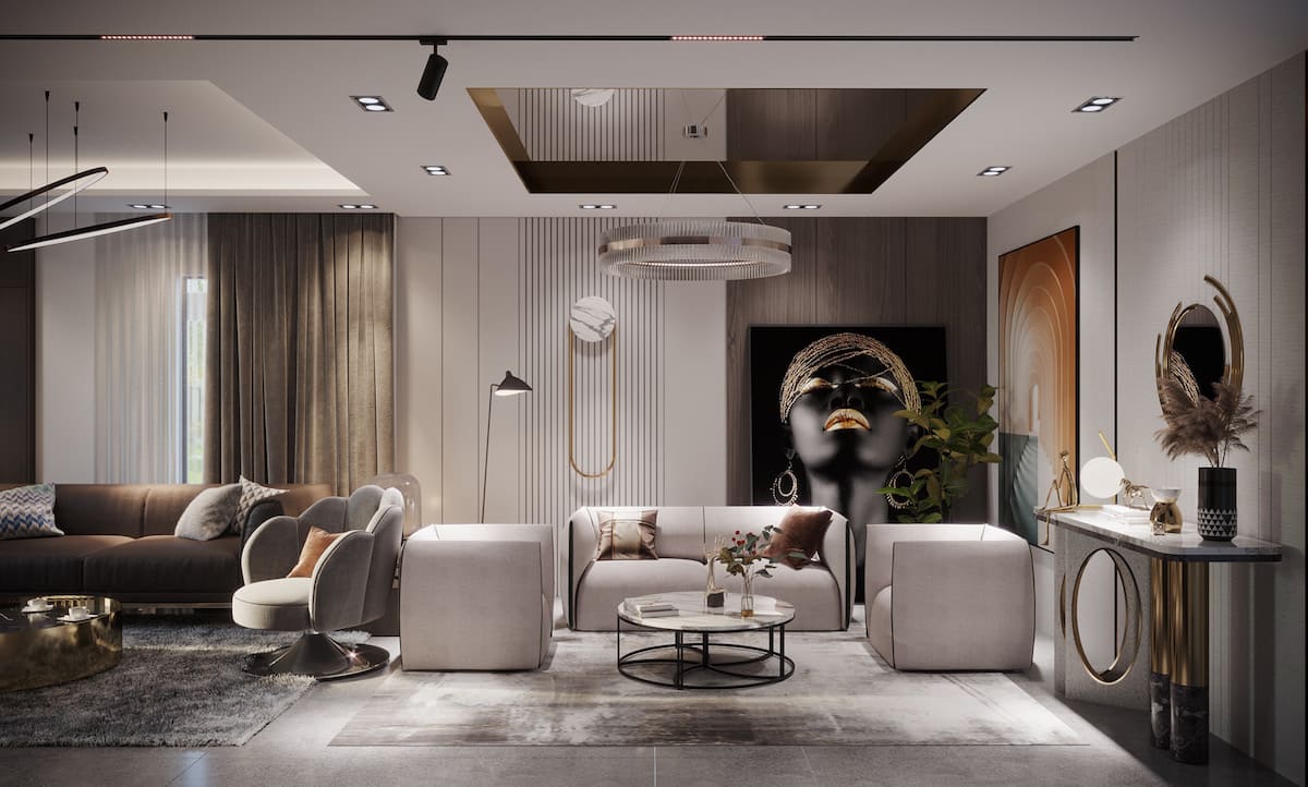 Еще одна современная тенденция — это зонирование помещений при помощи многоуровневых подвесных потолочных конструкций. В идеале визуальные границы повторяются в решении полового покрытия.