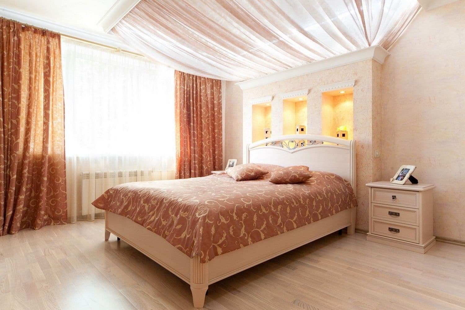 Основное, что нужно учитывать здесь – это его способность дать Вам расслабиться и отдохнуть, то есть он не должен заострять на себе Ваше внимание. Даже если у Вас небольшая комната, зеркальный потолок будет здесь не очень уместен