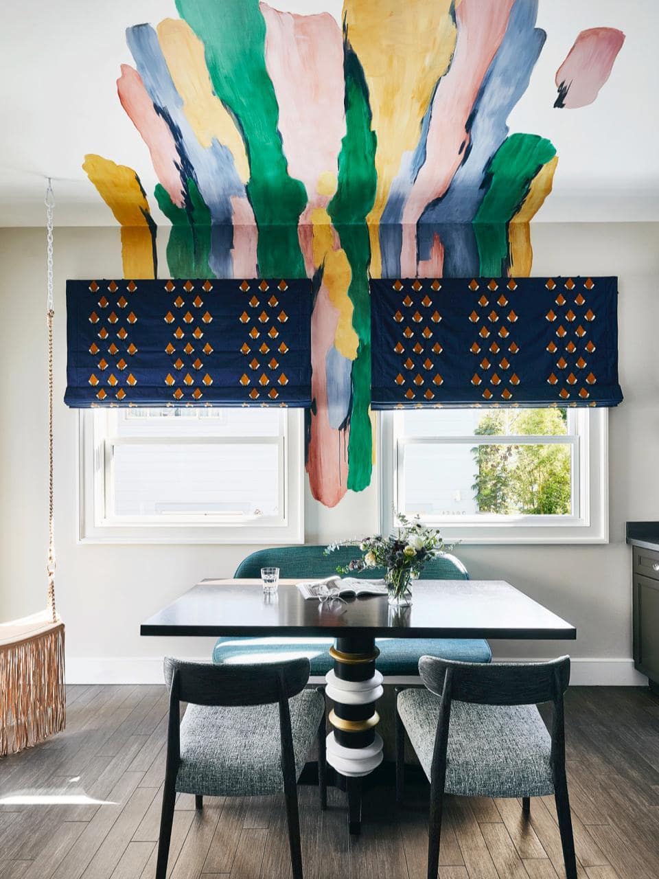 Интересно смотрится орнамент, переходящий с потолочной плоскости на часть стены. Такое решение позволяет элегантно зонировать пространство, внося в него необычный декоративный элемент.