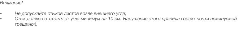 Сначала расшиваются швы не заводского производства. Отсутствие в них специальной фаски делает их более уязвимыми, подверженными к образованию трещин. Расшив их, под углом в 45 градусов, нужно заполнить специально предназначенными смесями и дать просохнуть, затем укрепить армирующим материалом. И только после этого, огрунтовав поверхность, приступают к шпатлевке или левкасу.Щели, образованные листами в местах их примыкания к стенам тоже заполняются раствором и армируются либо закрываются галтелями.
