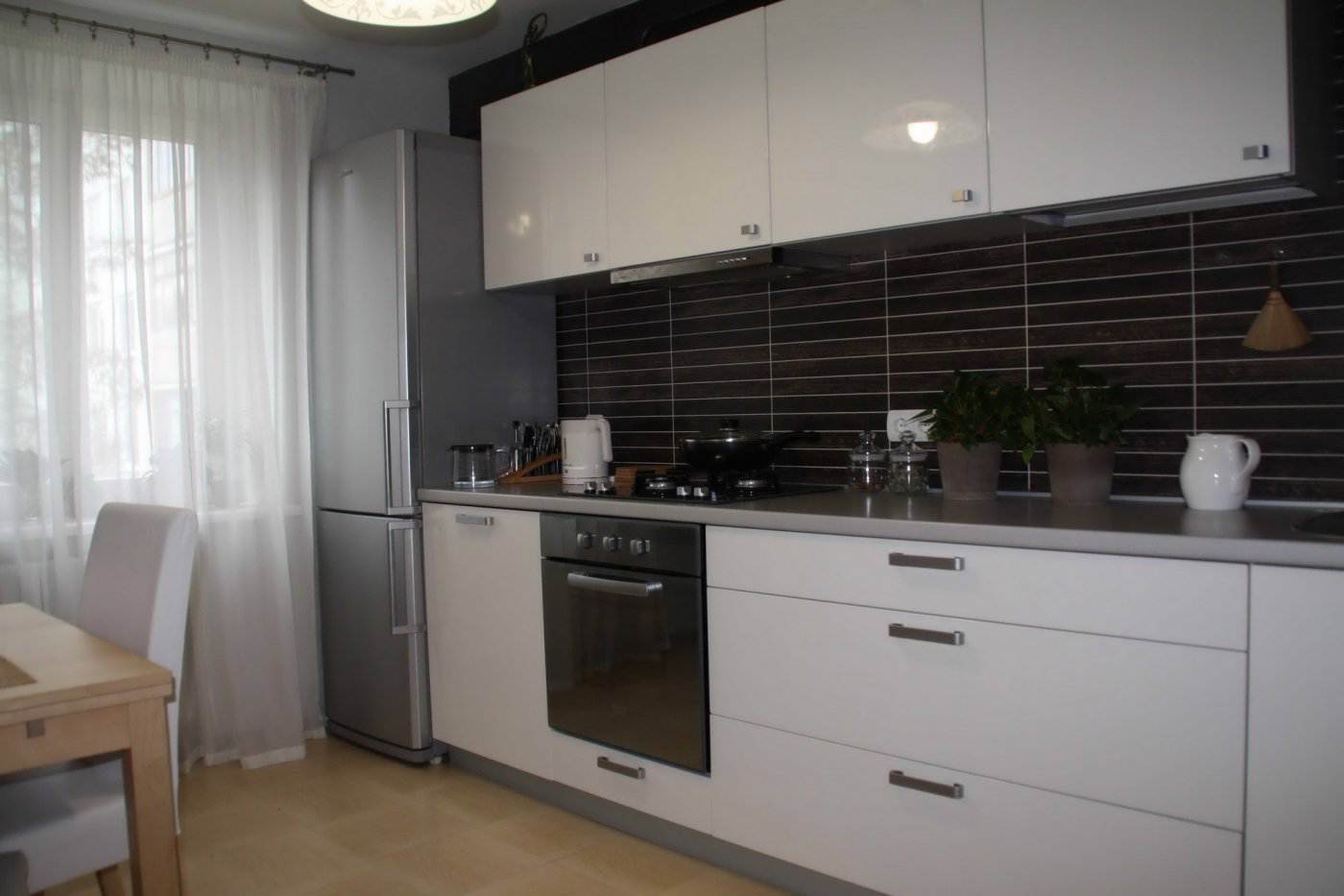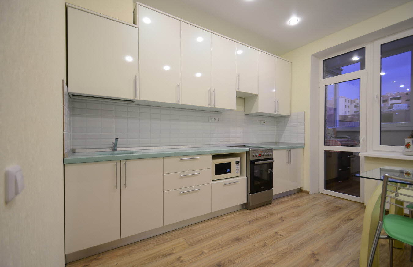 Прямое размещение гарнитура имеет свои плюсы и минусы, которые нужно учитывать еще во время планировки организации пространства.