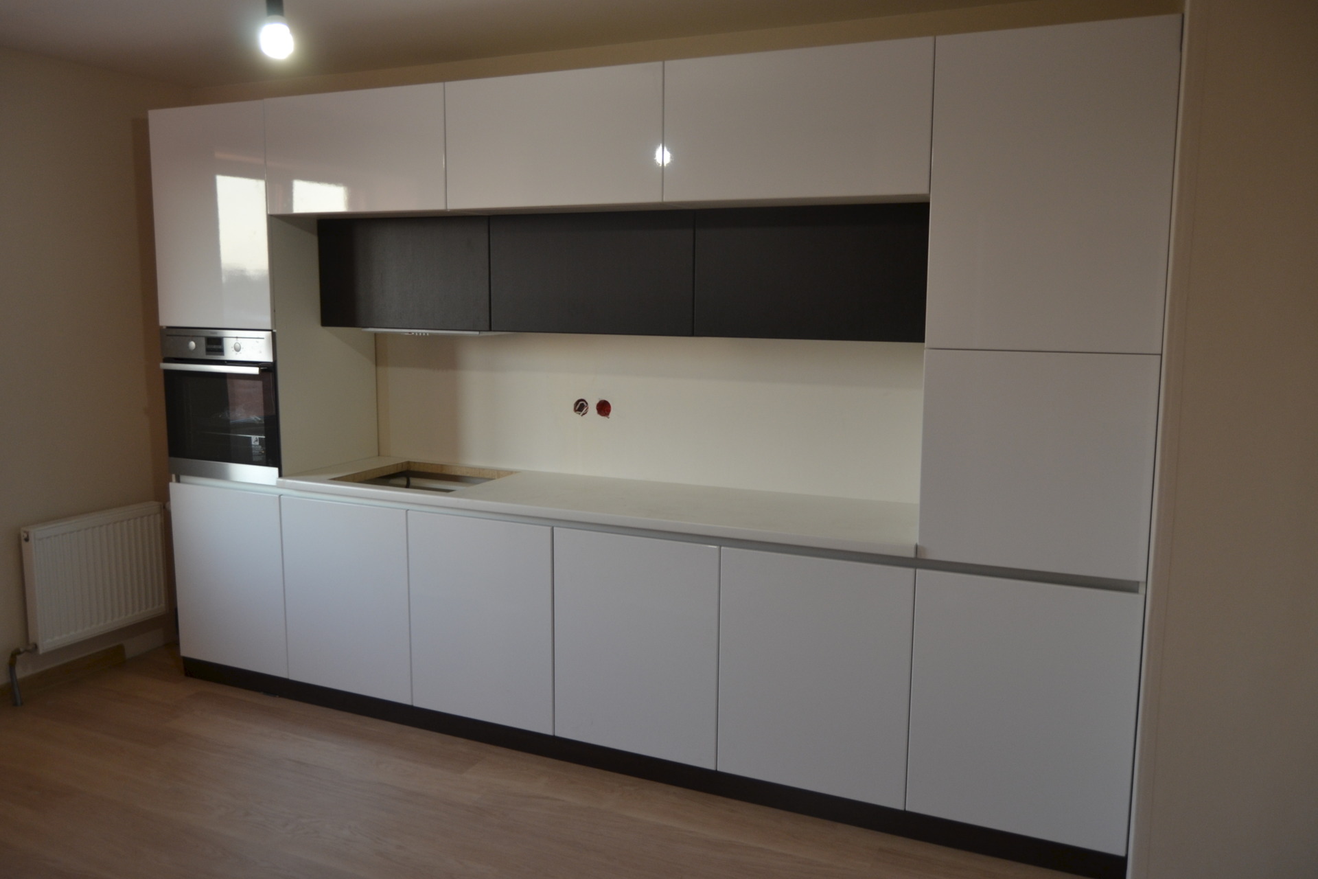 - Для квартиры со студийной планировкой хорошо подойдет дизайн-проект прямой кухни с двумя шкафами-пеналами по краям: в одном – встроенный холодильник, в другом – духовка и встроенные системы хранения.