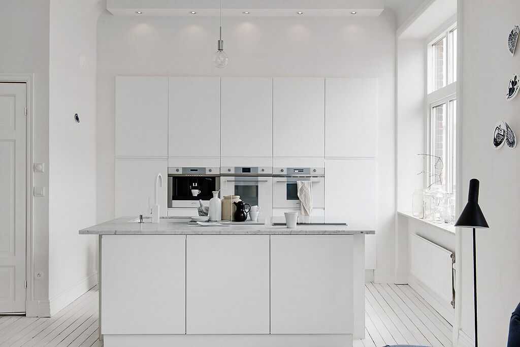 Дизайн узкой кухни гармоничнее всего выполнять в минималистичном или скандинавском стиле. Сдержанность этих стилей подойдет как нельзя кстати, ведь на узкой кухне не допустимы какие-либо лишние предметы или массивные конструкции. Эти стили любят порядок, простоту, минимум мелочей, загромождающих пространство, — как раз то, что нужно на длинной кухне. Светлые тона лучше выбирать не только для отделки, но и при выборе мебели.