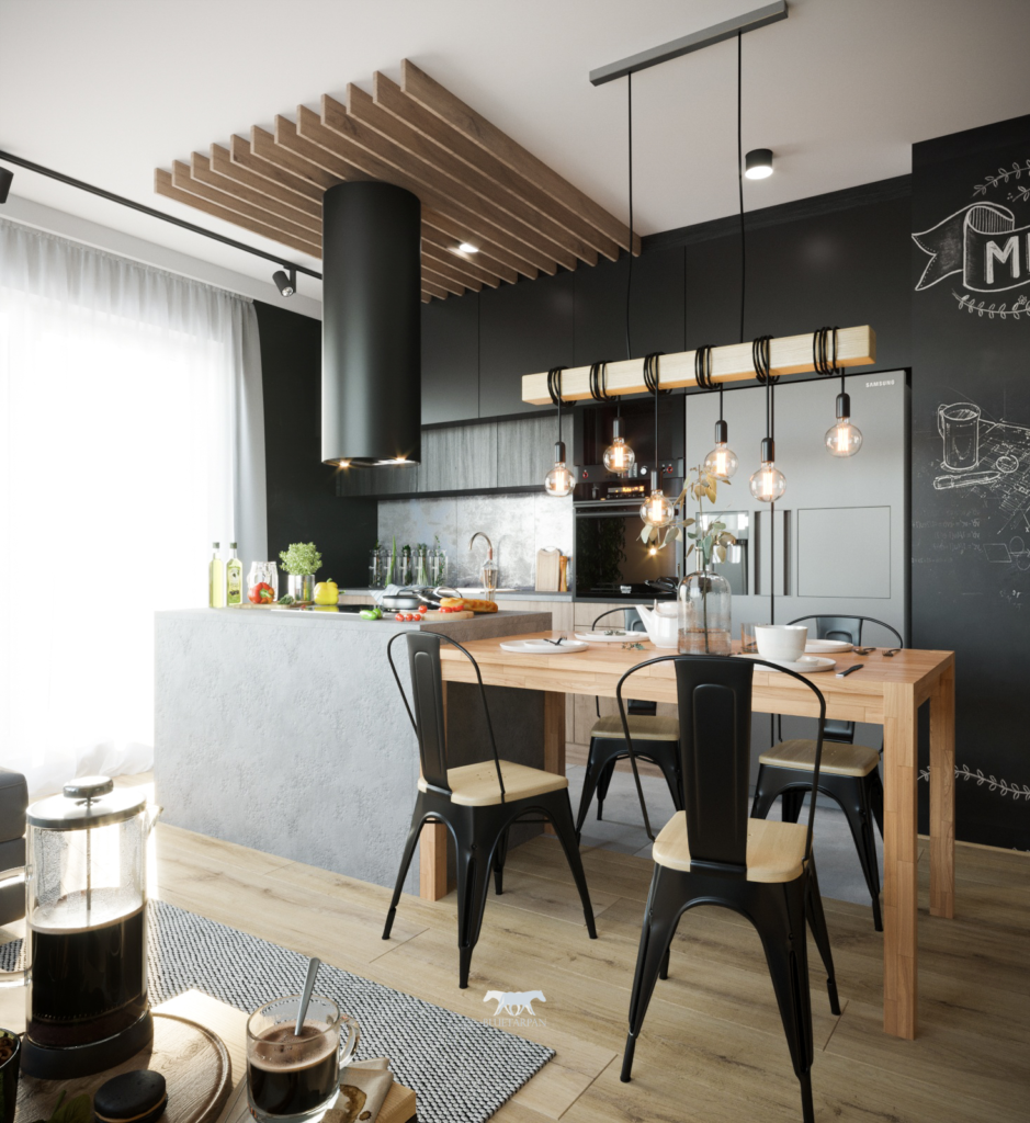 При формировании пространства выделяют главный элемент дизайна. В спальне центральной деталью станет кровать, на кухне – обеденная группа или «остров». В зале фокусной точкой можно сделать панель ТВ, портал камина или изображение (картину, фото), в прихожей – вешалку