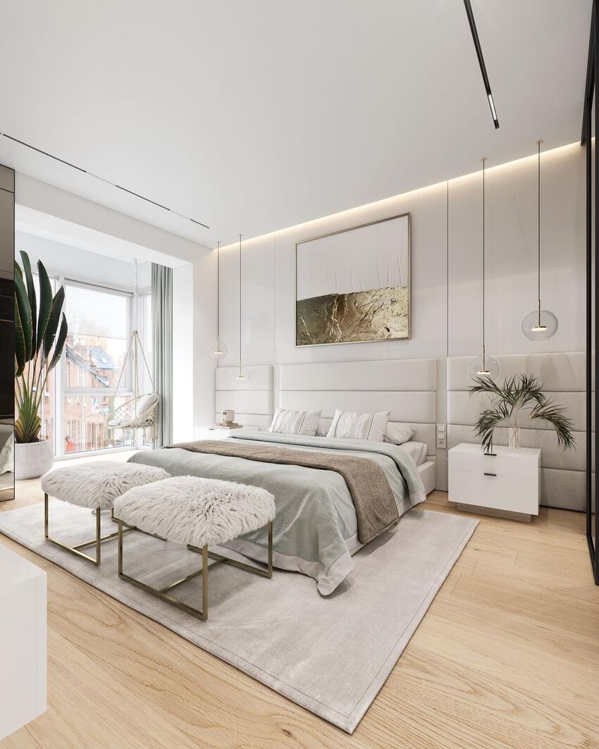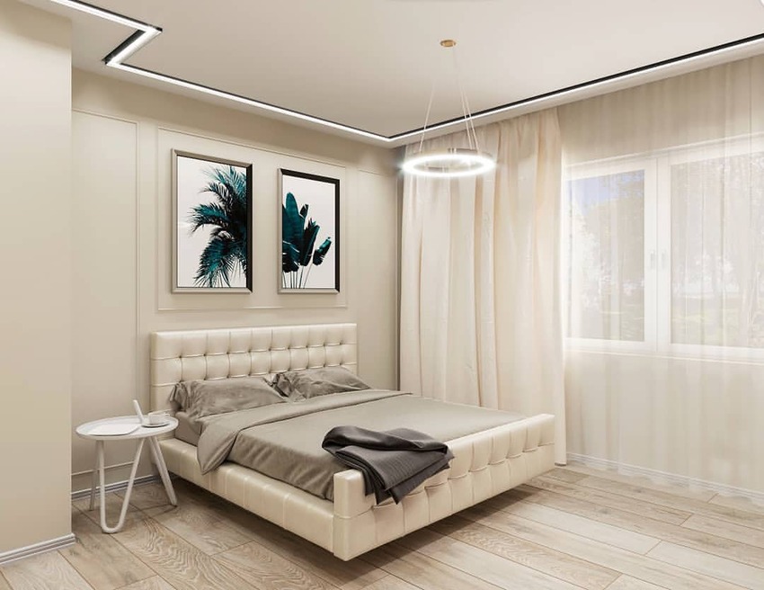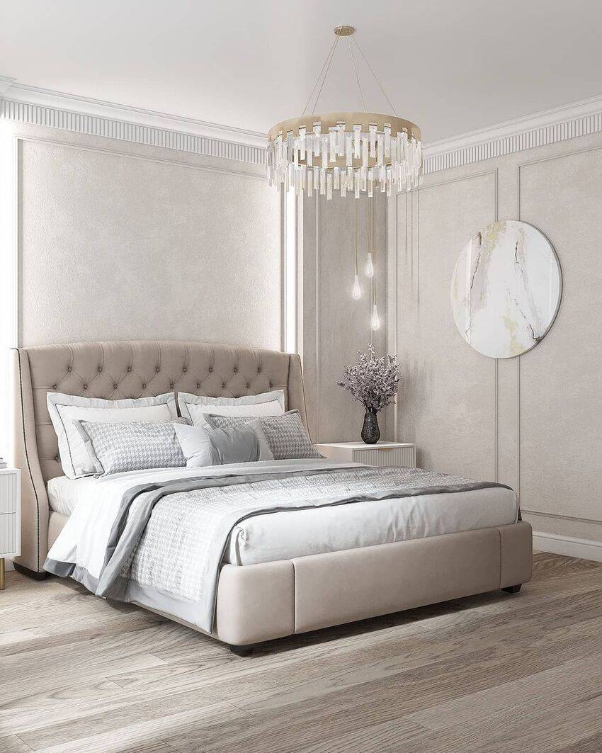 Допускаются акценты в виде картин, изысканных торшеров, керамических фигур, комнатных растений. Постельное белье должно быть шелковым либо хлопковым, без заметных принтов. Точечное светодиодное освещение по периметру и прикроватные бра с матовыми молочно-белыми плафонами помогут создать спокойную атмосферу и настроиться на безмятежный сон.