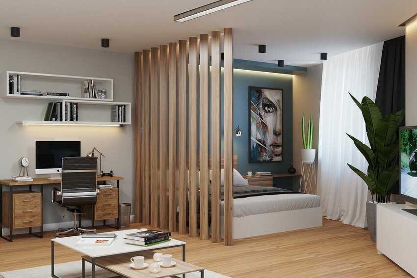 Для разделения пространства на зоны подойдут стационарные перегородки, открытые или закрытые стеллажи, раздвижные стеклянные или тканевые панели, текстильные или декоративные шторки. Если хочется сохранить единство пространства, можно сделать условное зонирование, используя для оформления частей комнаты разные фактуры, материалы и цвета.