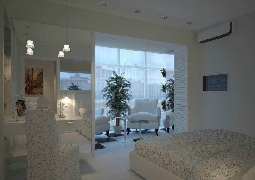 Спальня, объединенная с утепленной лоджией – это огромное поле для деятельности. Дополнительную площадь можно использовать для обустройства одной из зон, что позволит саму комнату сделать более просторной и лёгкой.