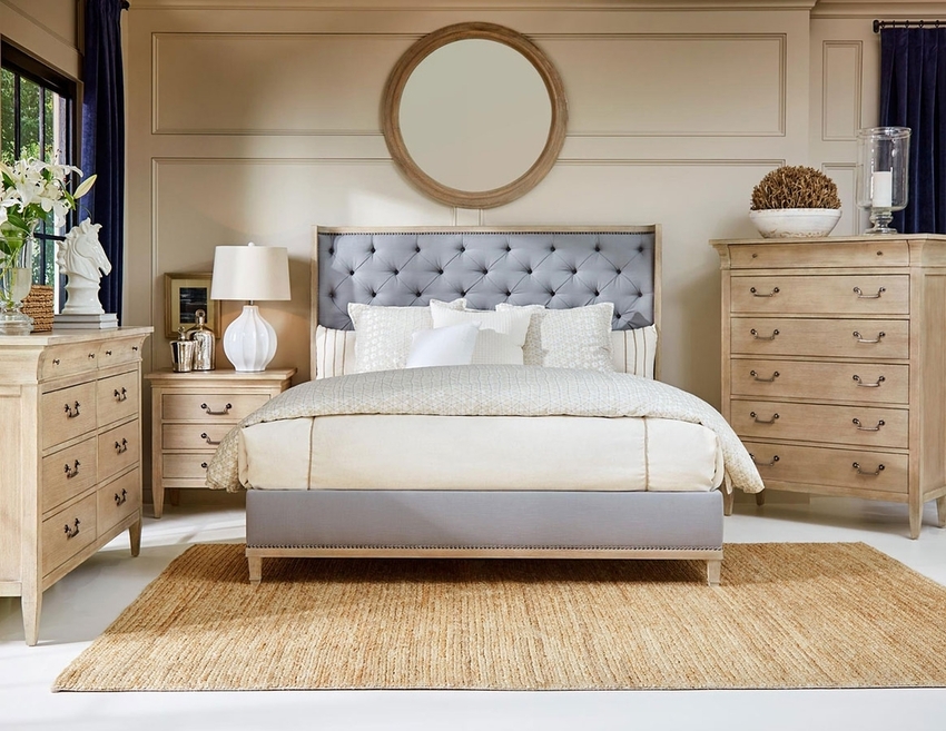 Большая кровать является центральным элементом, и вся остальная мебель координируется с ней. Белая кровать с голубым постельным бельем, нежно-голубые шторы с белыми подвязками и старинные картины на стенах будут смотреться очень красиво.