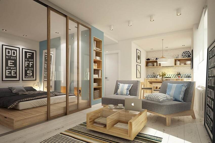 Обязательно стоит воспользоваться приемами для экономии пространства. Большие шкафы можно заменить полками вдоль стен, а также стоит отказаться от привычных «стенок». Лучше обратиться к мебели с возможностью трансформирования и со встроенными системами хранения. Все основные элементы гостиной и спальни должны иметь несколько функций. Кровать одновременно может выполнять функции шкафа, если в ней есть специальные ящики для хранения белья. Телевизор на стене со светодиодной подсветкой может выступить еще и в качестве ночной лампы, а комод с откидной крышкой-зеркалом прекрасно заменит трюмо.