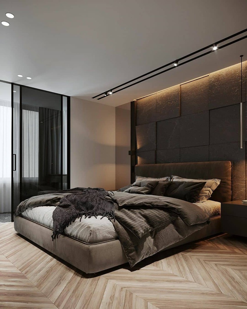 Темные оттенки в спальне подобного размера будут выглядеть органично, однако они визуально скрадывают размеры помещения. За счет этого комната становится более маленькой и уединенной.