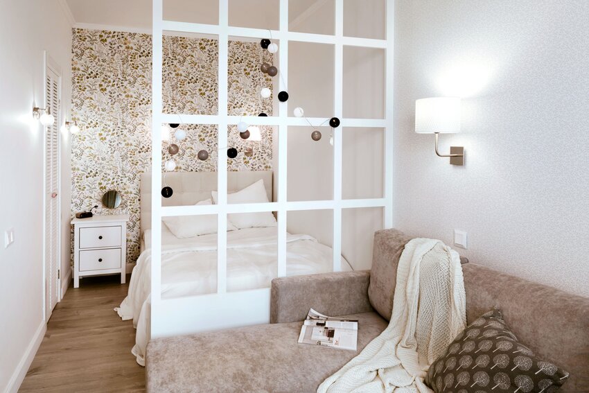 Отлично подойдут стационарные или раздвижные стеклянные перегородки, ширма, шторки из ткани, нитей или бус.