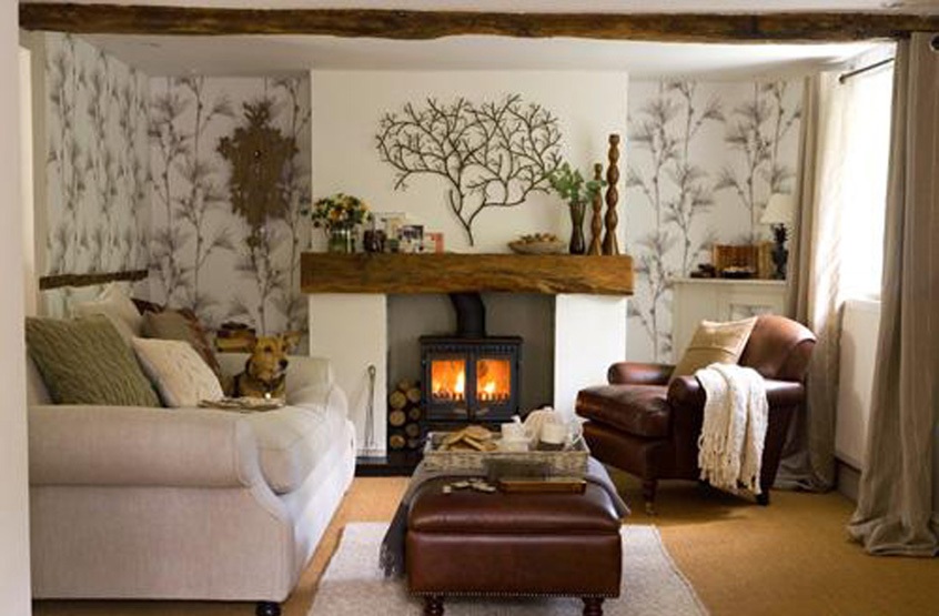 - Кантри. Примитивность и простота — это главные черты стилистического направления. В гостиной с таким интерьером приветствуется использование натуральных материалов. В качестве отделки выступают светлые обои с растительным или цветочным принтом.