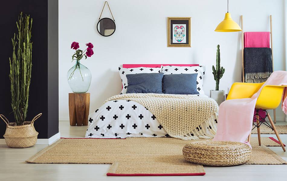 - Гостиная и спальня. Поскольку эти комнаты сочетают в себе больше различных функций, чем ванная и детская, то здесь стоит отказаться от тотальной покраски потолка и стен в желто-зеленый контраст. В этих комната лучше использовать лишь элементы, разбавляя их белым, серым, бежевым или каким-либо другим нейтральным цветом.