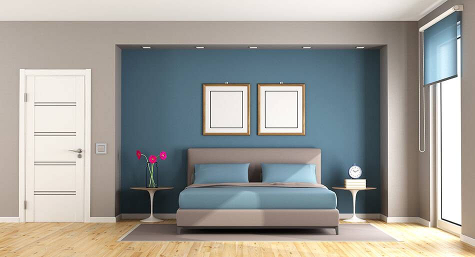 - Выделять лучше стену, которая первой бросается в глаза при входе в спальню.