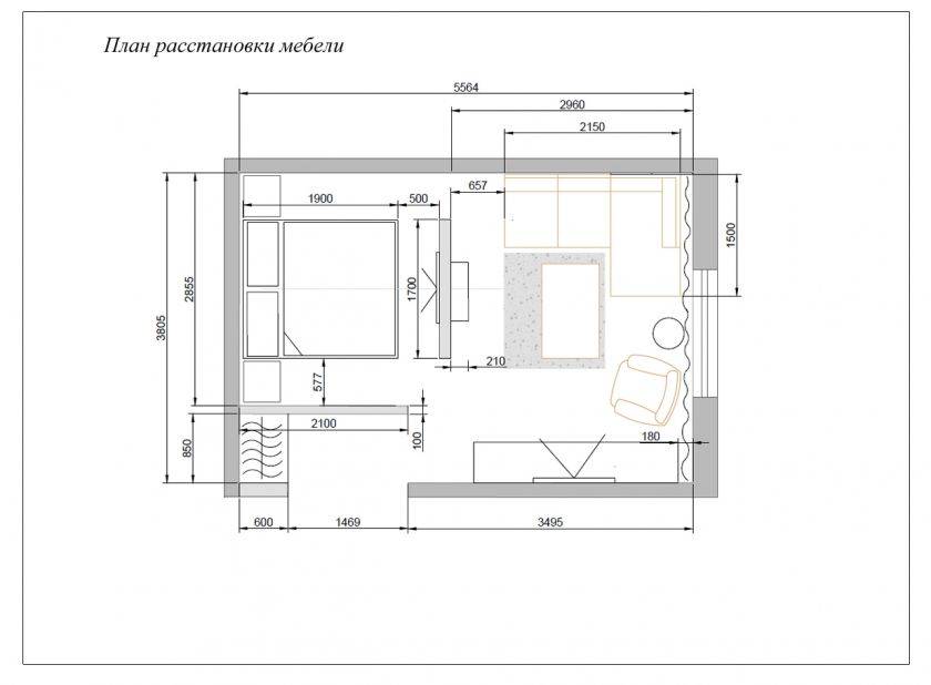 - Продумайте проходы между мебелью: минимальное расстояние 0,5 метра, а лучше 0,75-1 метр.