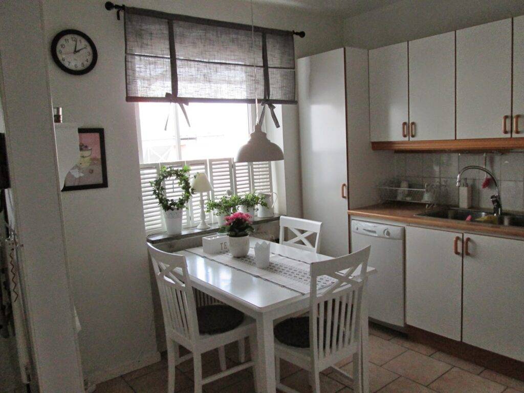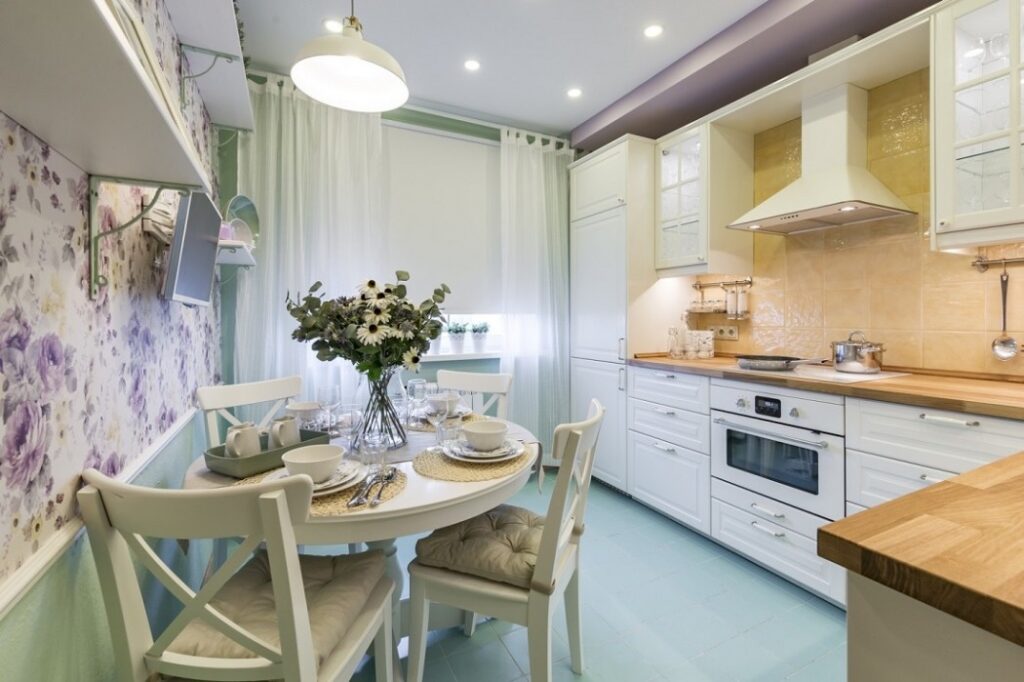 - в маленькую кухню лучше подойдут светлые занавески или тюль, но не в одном тоне со стенами.