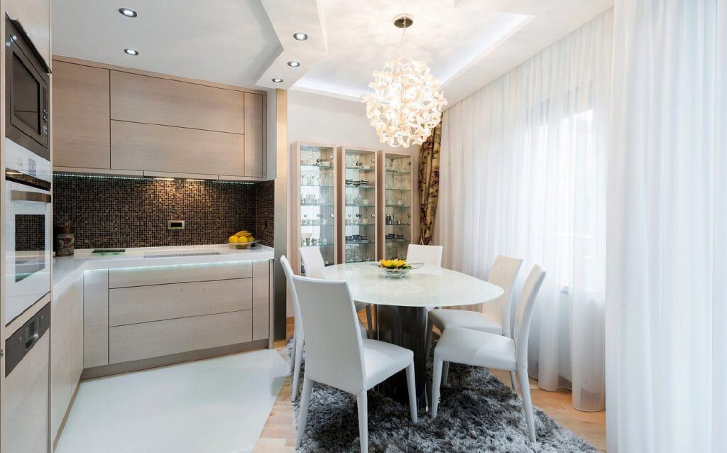 Для большой кухни подойдет практически любая ткань, а вот для маленькой комнаты важно подобрать материю, которая зрительно расширит границы. Сюда лучше выбрать светлый, летящий тюль