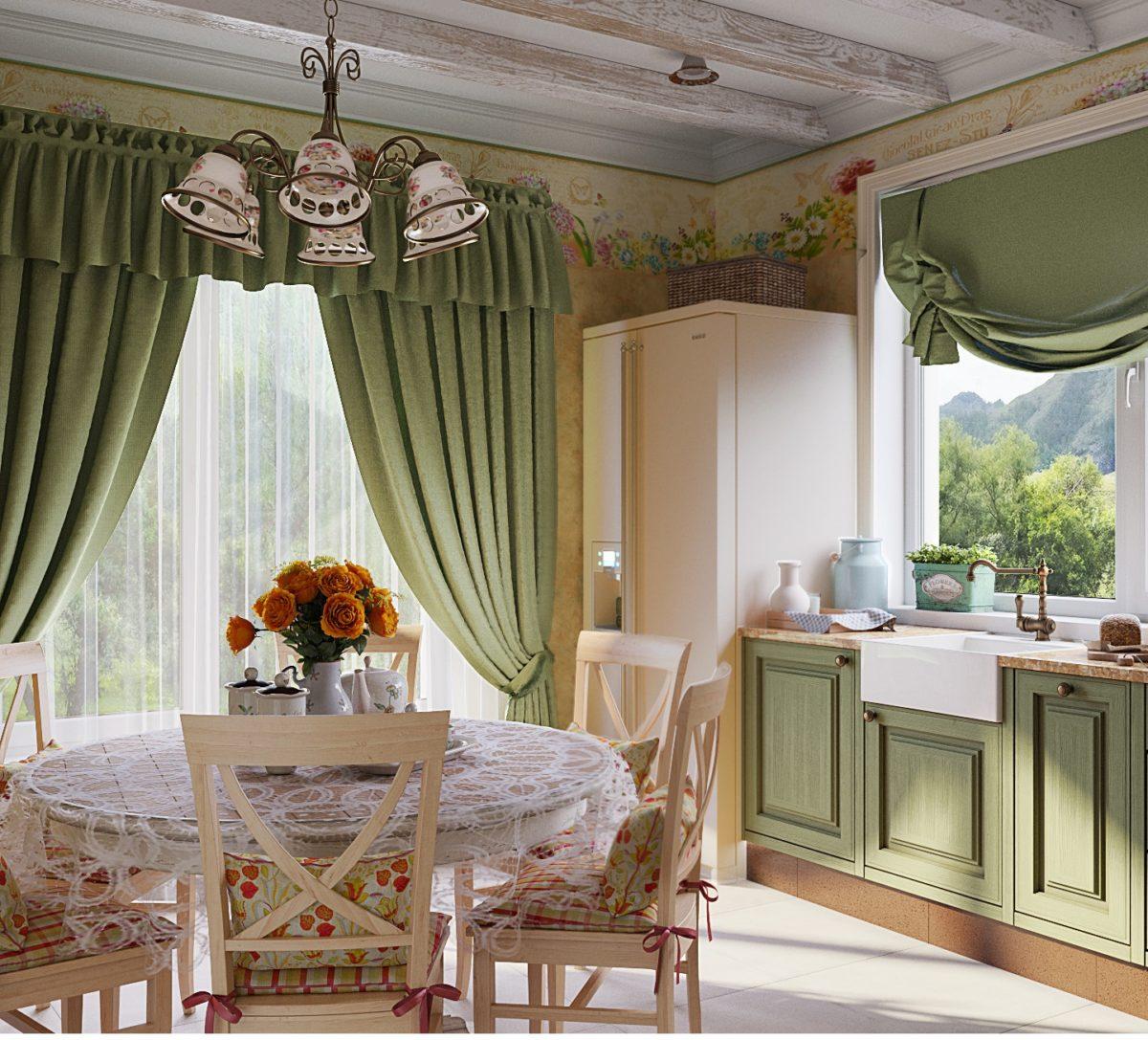 Для любителей деревенских стилей прекрасно подойдут полотна с мелким цветочным орнаментом, а также укороченные шторки из хлопка или льна. В кантри и провансе особенно ценятся орнаменты в клетку или полоску. А для интерьера в стиле шебби-шик лучшим решением станут кружевные занавеси в тон скатерти.