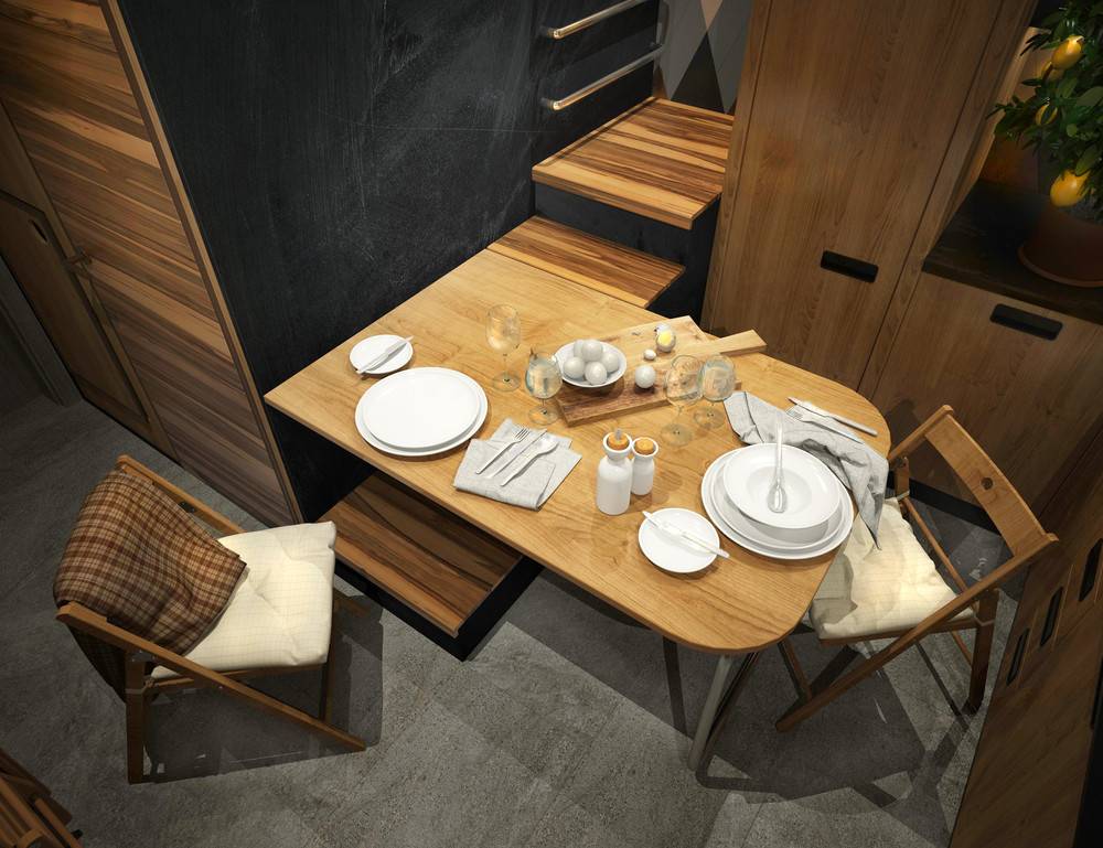 Например, обеденный стол и кресла рядом с ним на ночь можно трансформировать в дополнительное спальное место – удобную кушетку. Стол переворачивают – сверху оказывается мягкая поверхность – и опускают до уровня кресел. Механизм такого превращения подсказан дизайнеру поездками в плацкартном вагоне.