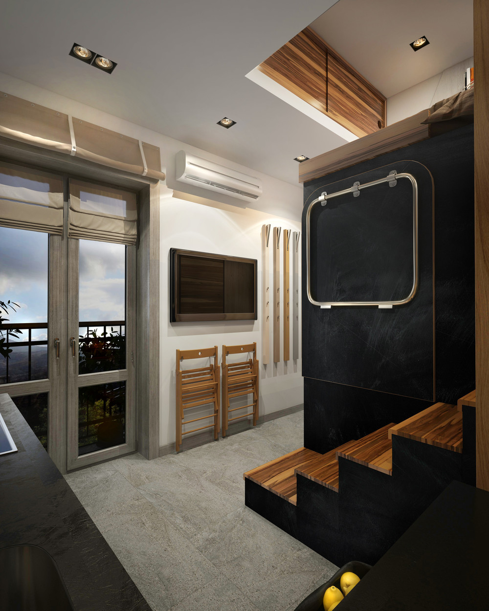 Поскольку общая площадь студии очень мала, стандартная мебель сюда не подходит – она заняла бы очень много места. Пришлось конструировать ее, «вписывая» в заранее отведенные места. Некоторые предметы совмещают в себе сразу несколько функций.